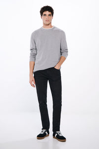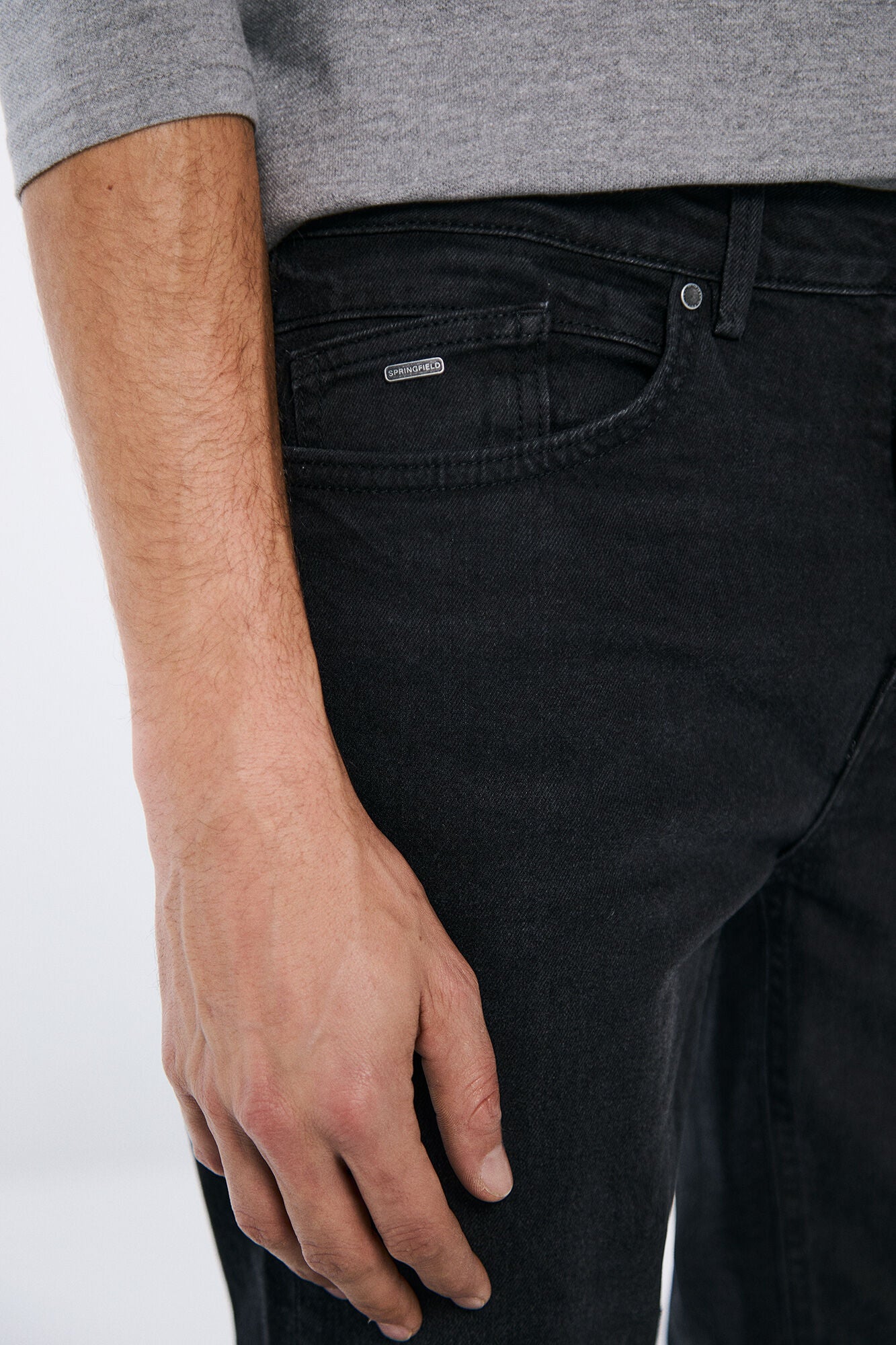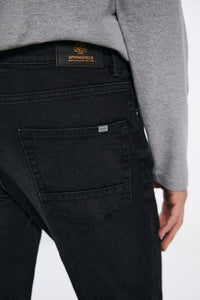 Skinny fit 5-pocket stretch jeans in black. Detail of badge on match pockets. Gentle wash, used look. Zip fly.