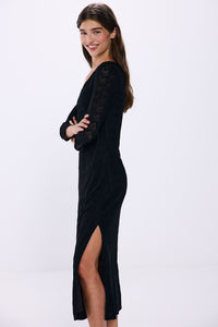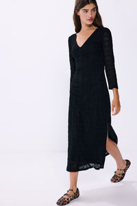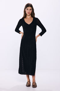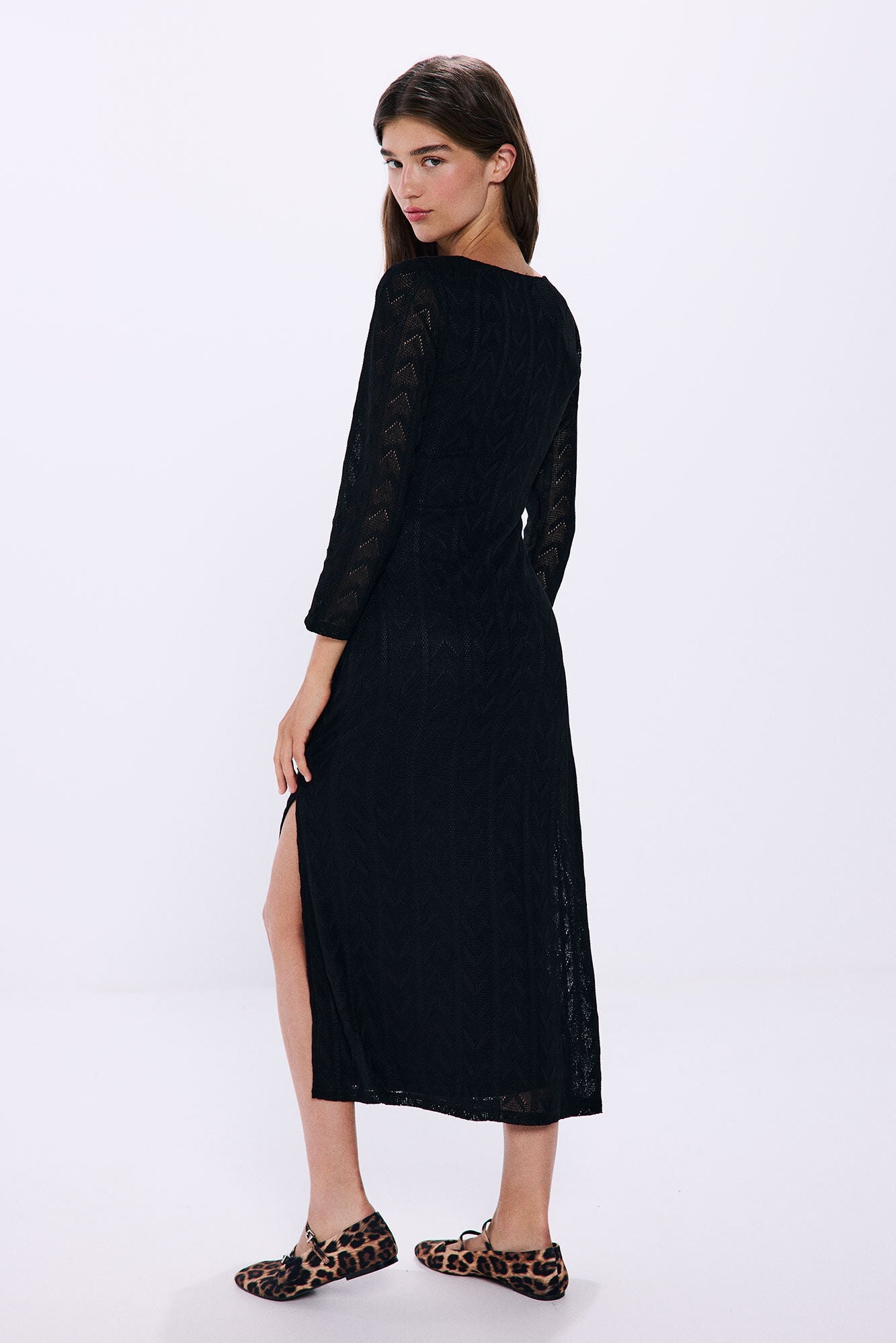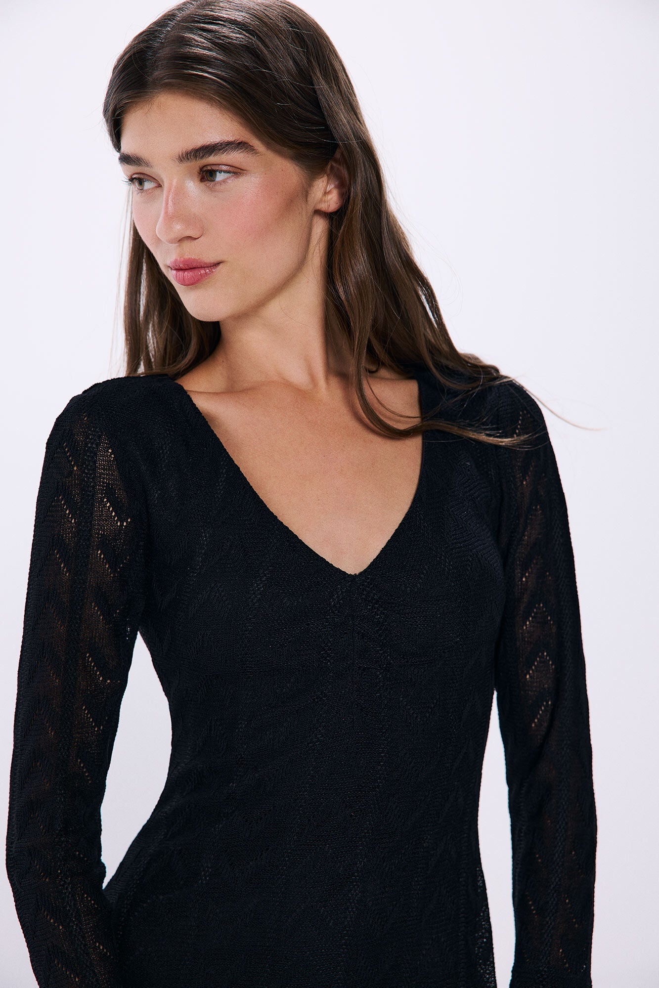 Fitted dress with long sleeve, with a V- neckline , with gathering on the front, in a plain color with structure and with a flared skirt .