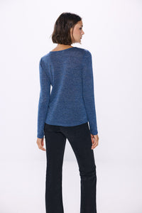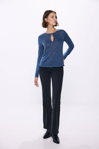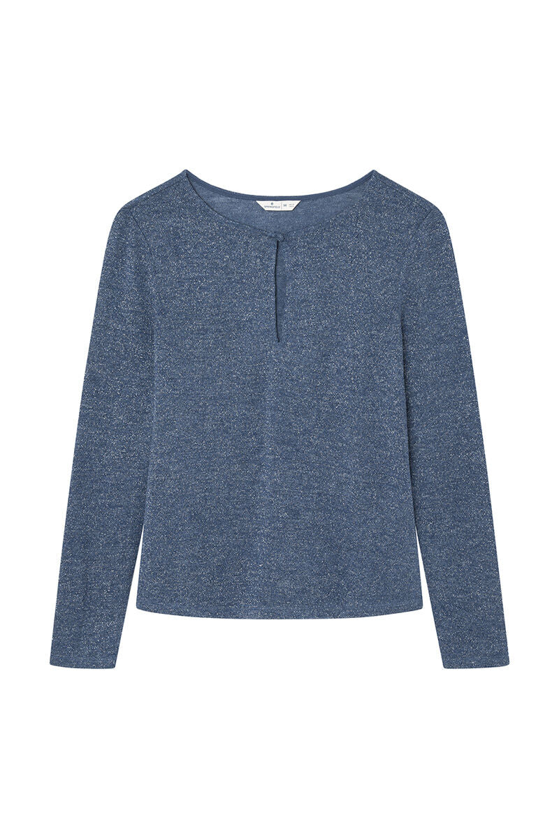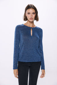 long sleeve T-shirt, with a round neck , with a teardrop-shaped neckline slit with button fastening and lurex.
