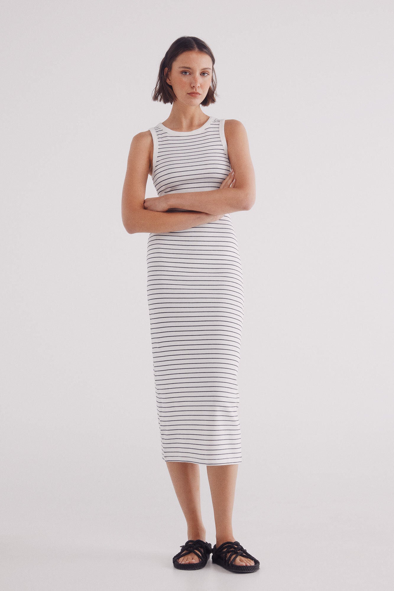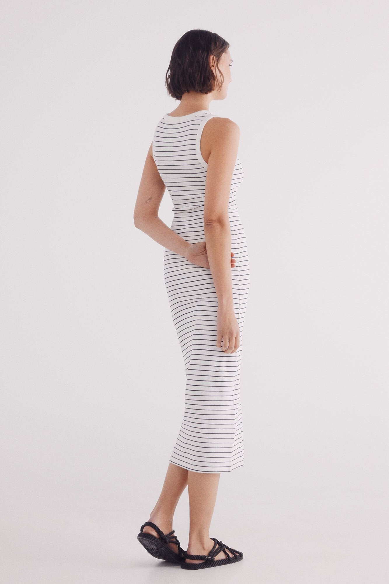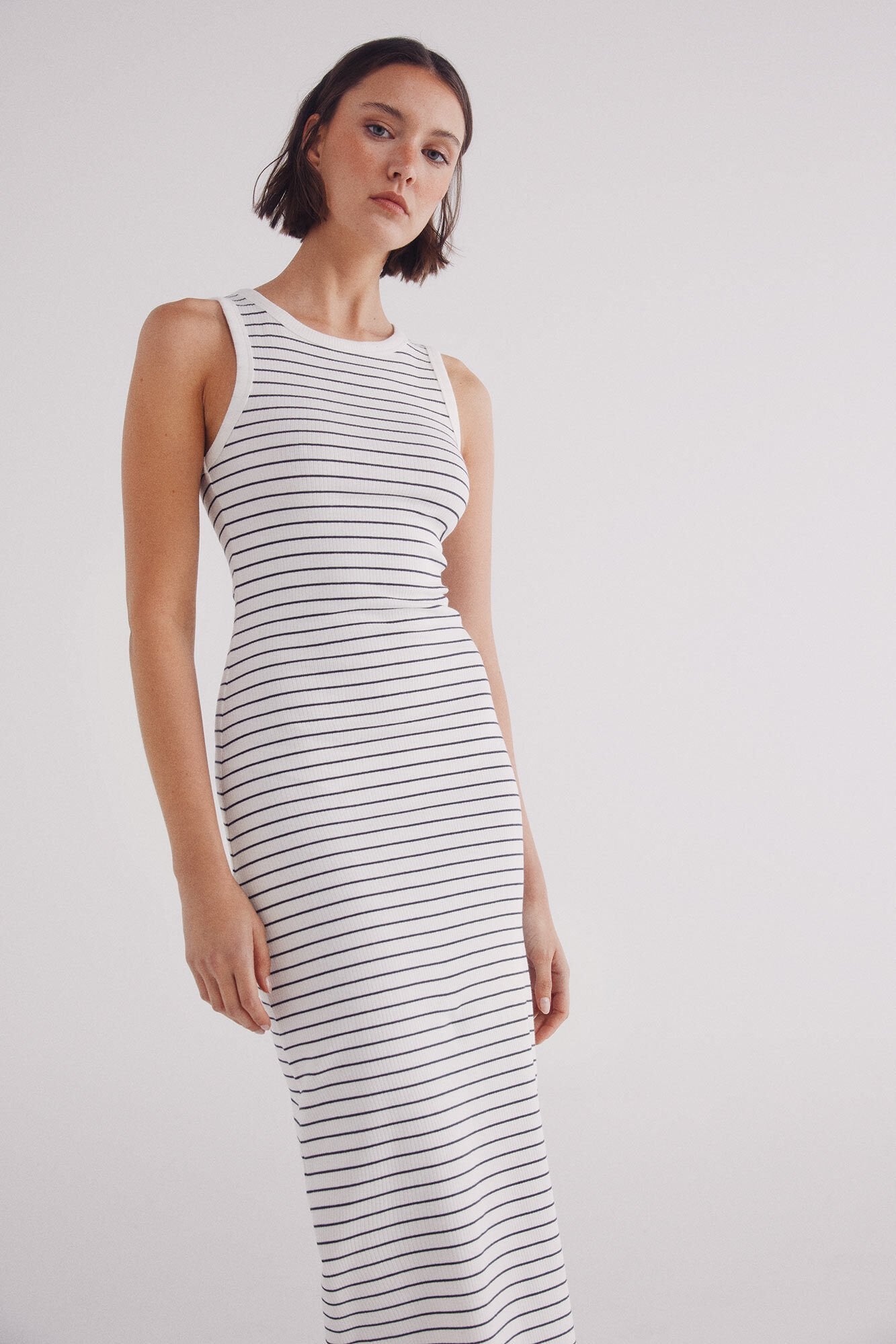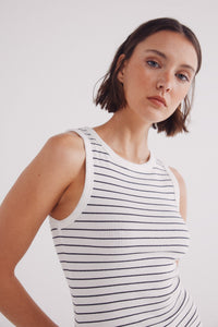 Fitted midi dress with straps and a racer back, with a round neck and horizontal sailor striped.