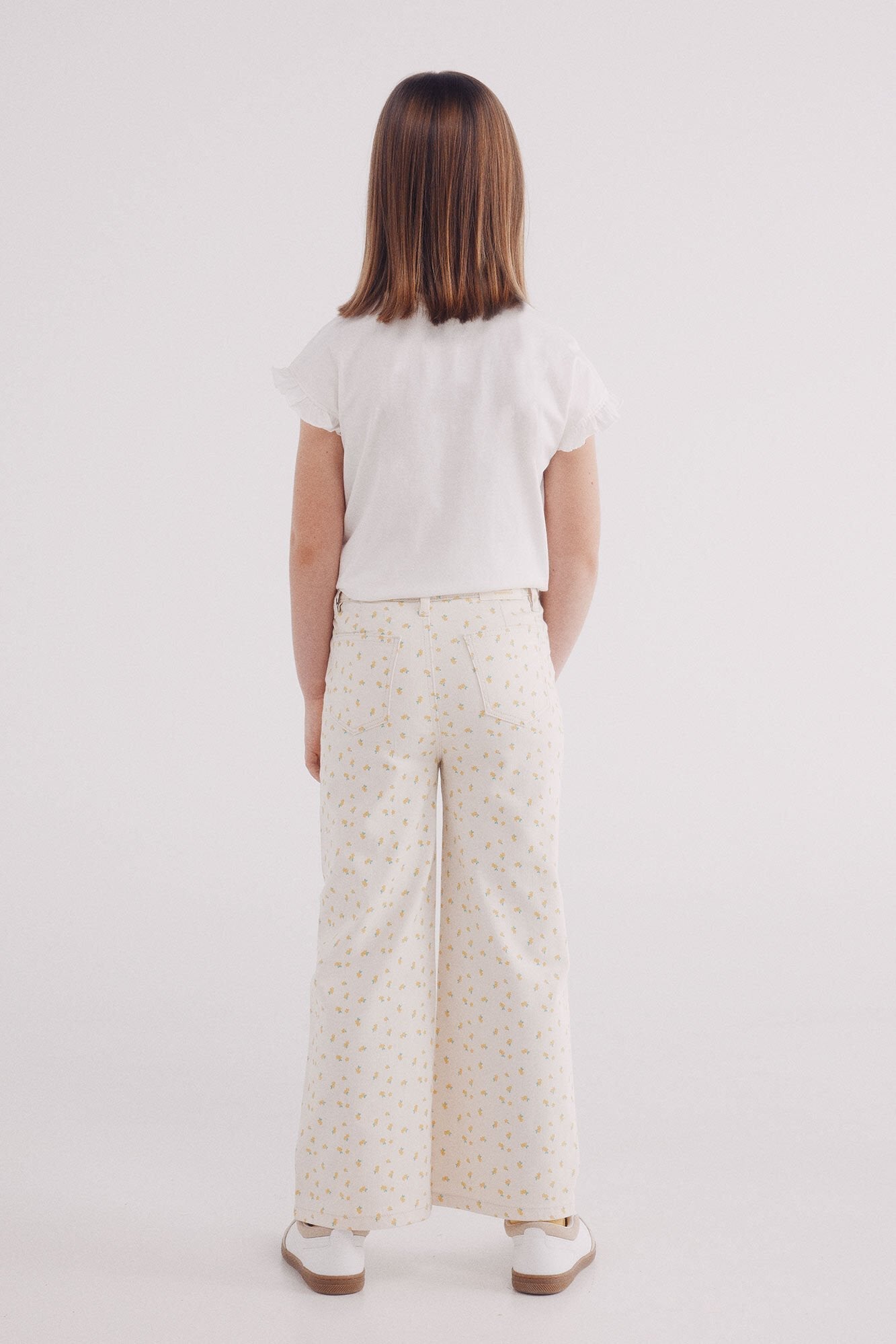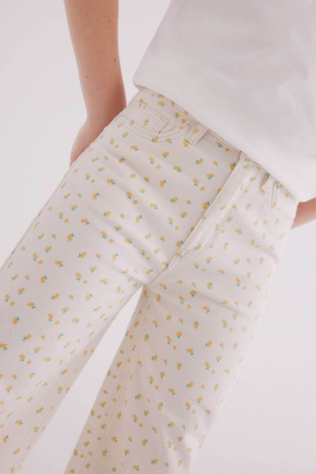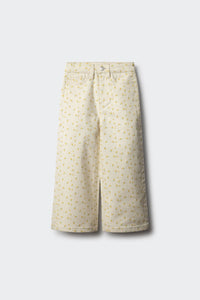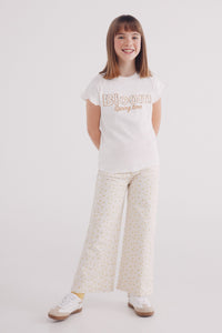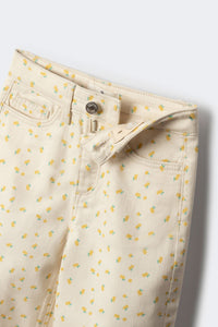 Trousers in stretch denim -style fabric in colour with floral embroidered for girls. Culotte fit. Mid-rise.ÊFive pocket design.ÊButton and zip fastening. Elasticated inner waistband regulator.